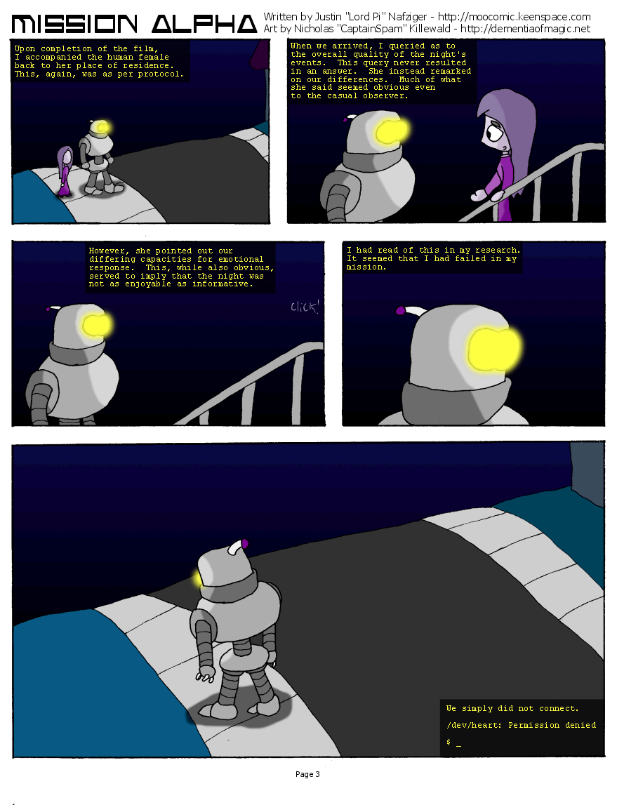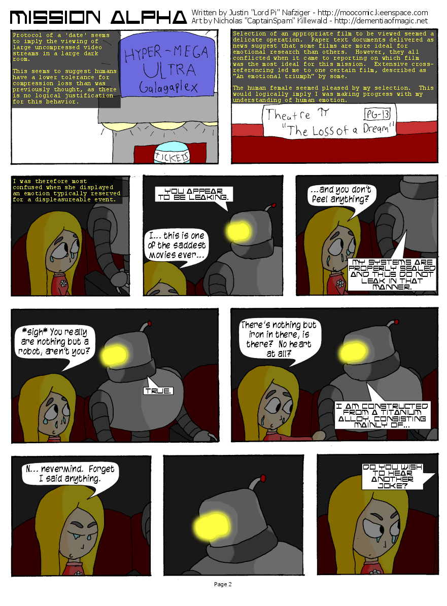 Hey. Welcome to CaptainSpam and Lord Pi's Blind Date 2004 entry, by Nicholas "CaptainSpam" Killewald of The Dementia of Magic and Justin "Lord Pi" Nafziger of Moocomic. I'm your host, CaptainSpam. Sorry for the minimalist page design.