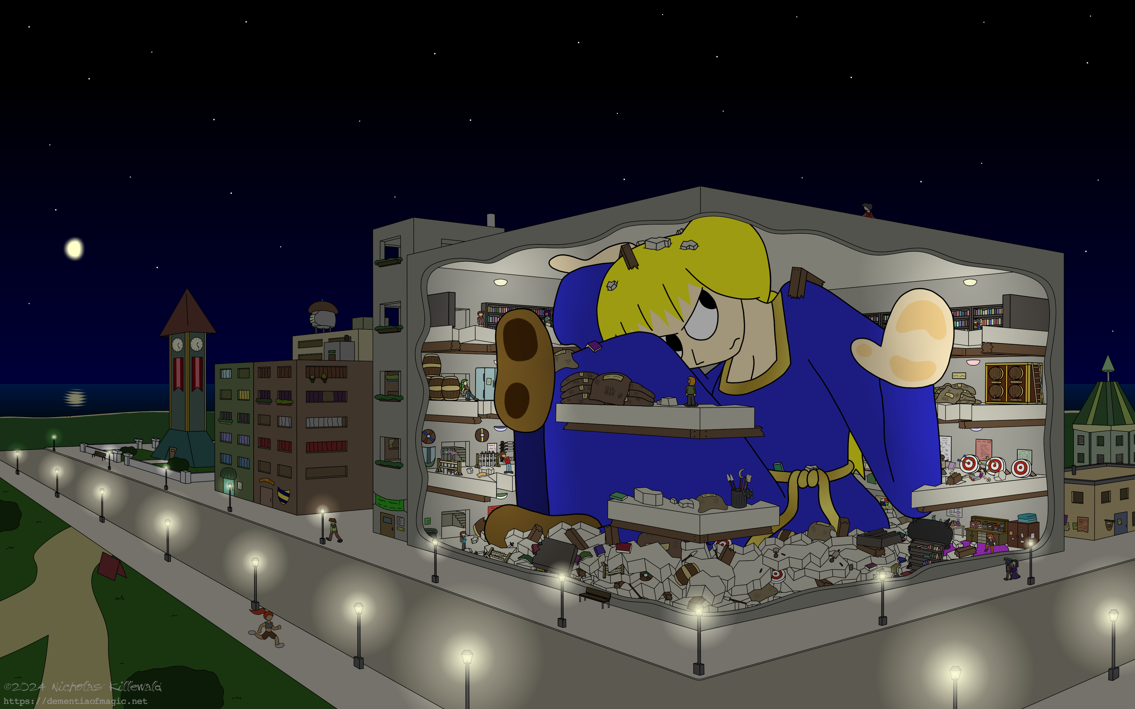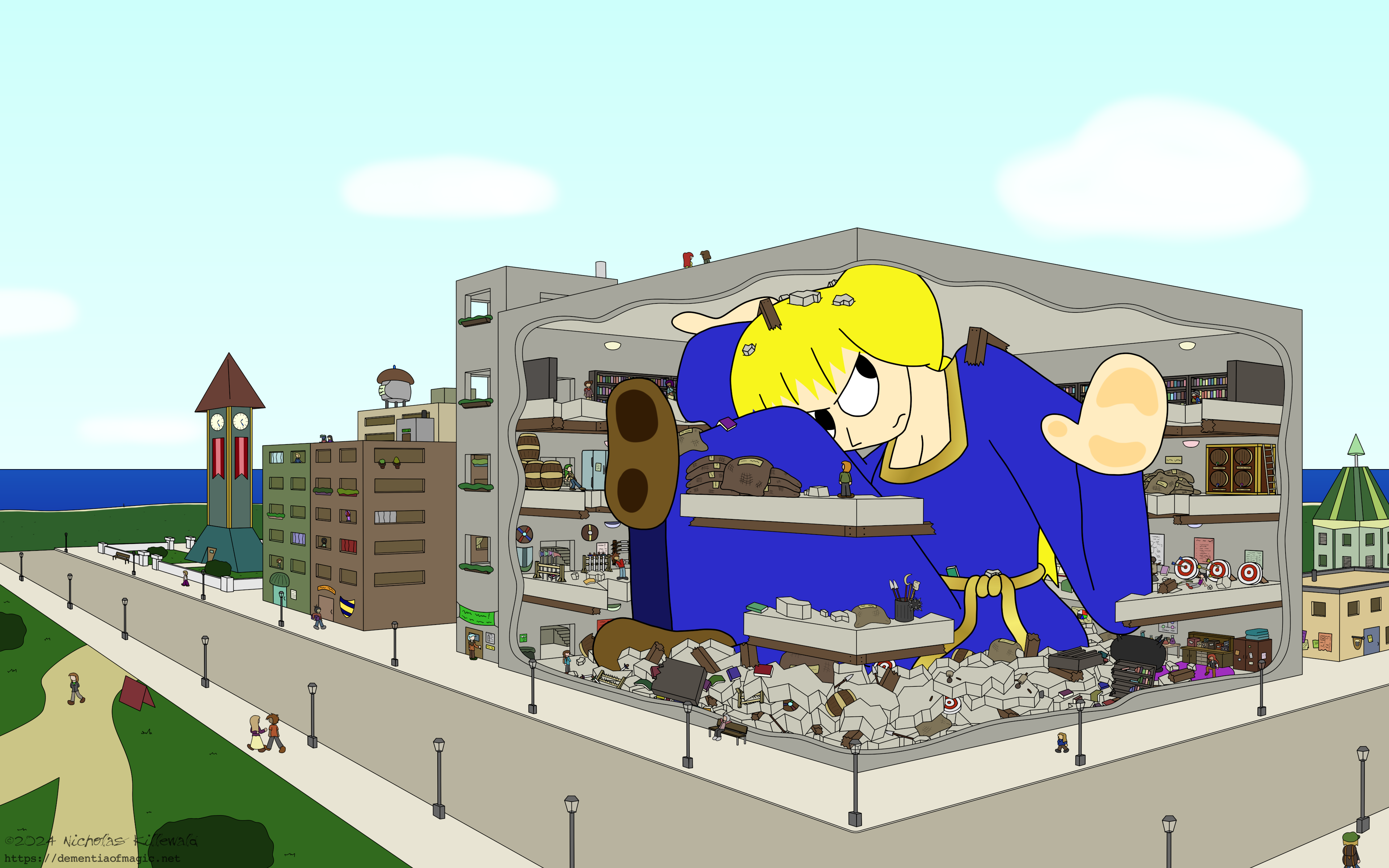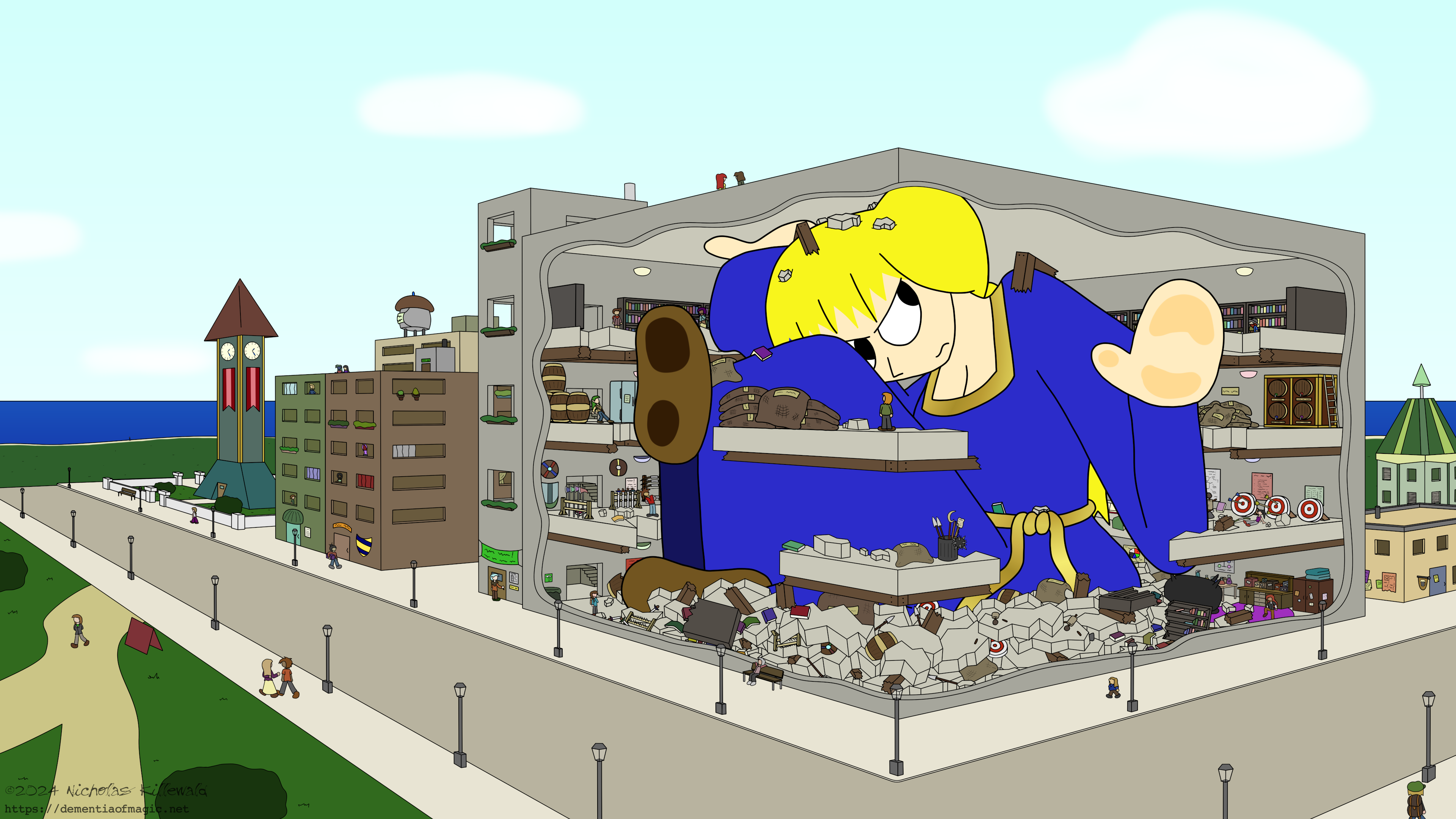 One day, I decided I wanted to try drawing character poses I don't draw very often. Hence, this pose of Alex stuck in a box. And then I started having fun until it kinda evolved from there to add in the building around her, and then a bunch of rubble, and then the rest of a city, and then more and more details, and eventually it turned into this wallpaper!