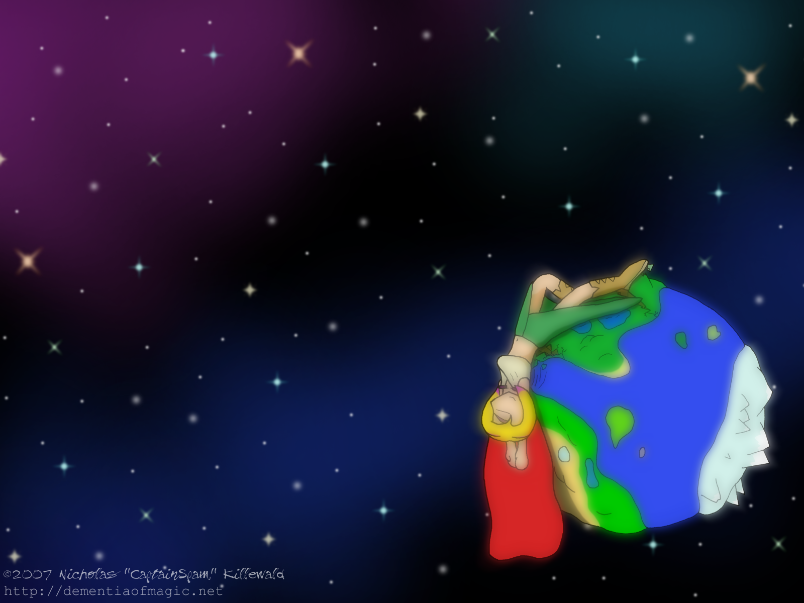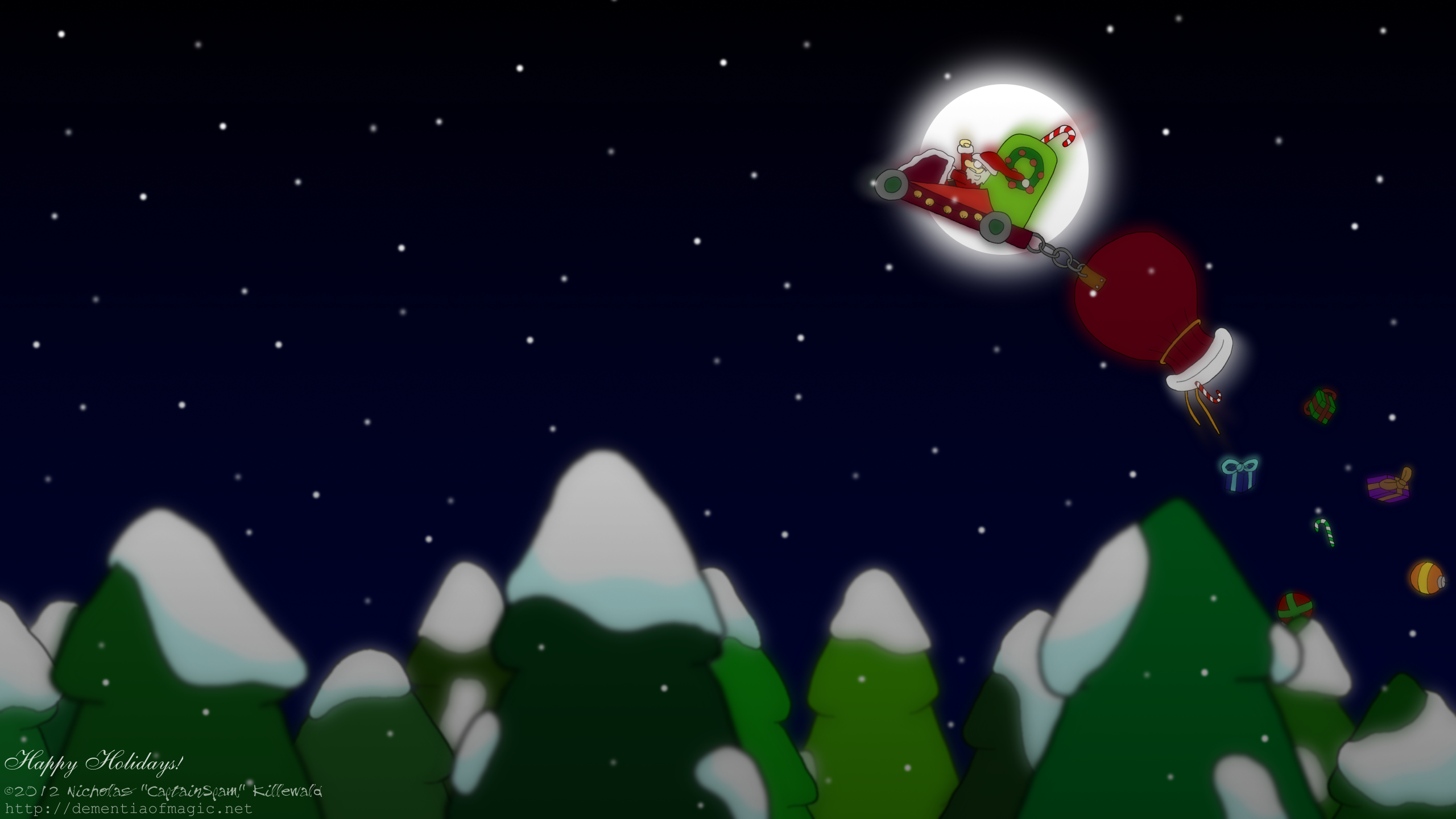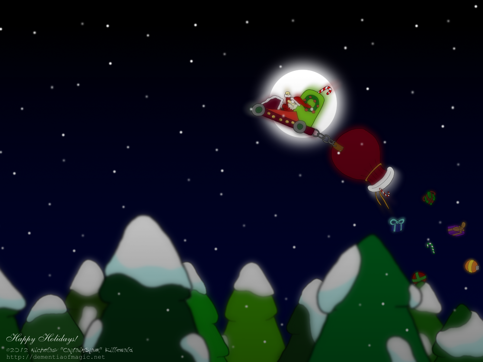 It's been another four years, hasn't it? Well, why not celebrate the holidays with our favorite jolly old dwarf, Cesol, as he rides his steam cart through the night sky, haphazardly distributing holiday cheer to... oh... let's say the people who live under his flight path. Hopefully. Happy holidays! Here's hoping it won't be another four years until the next one!