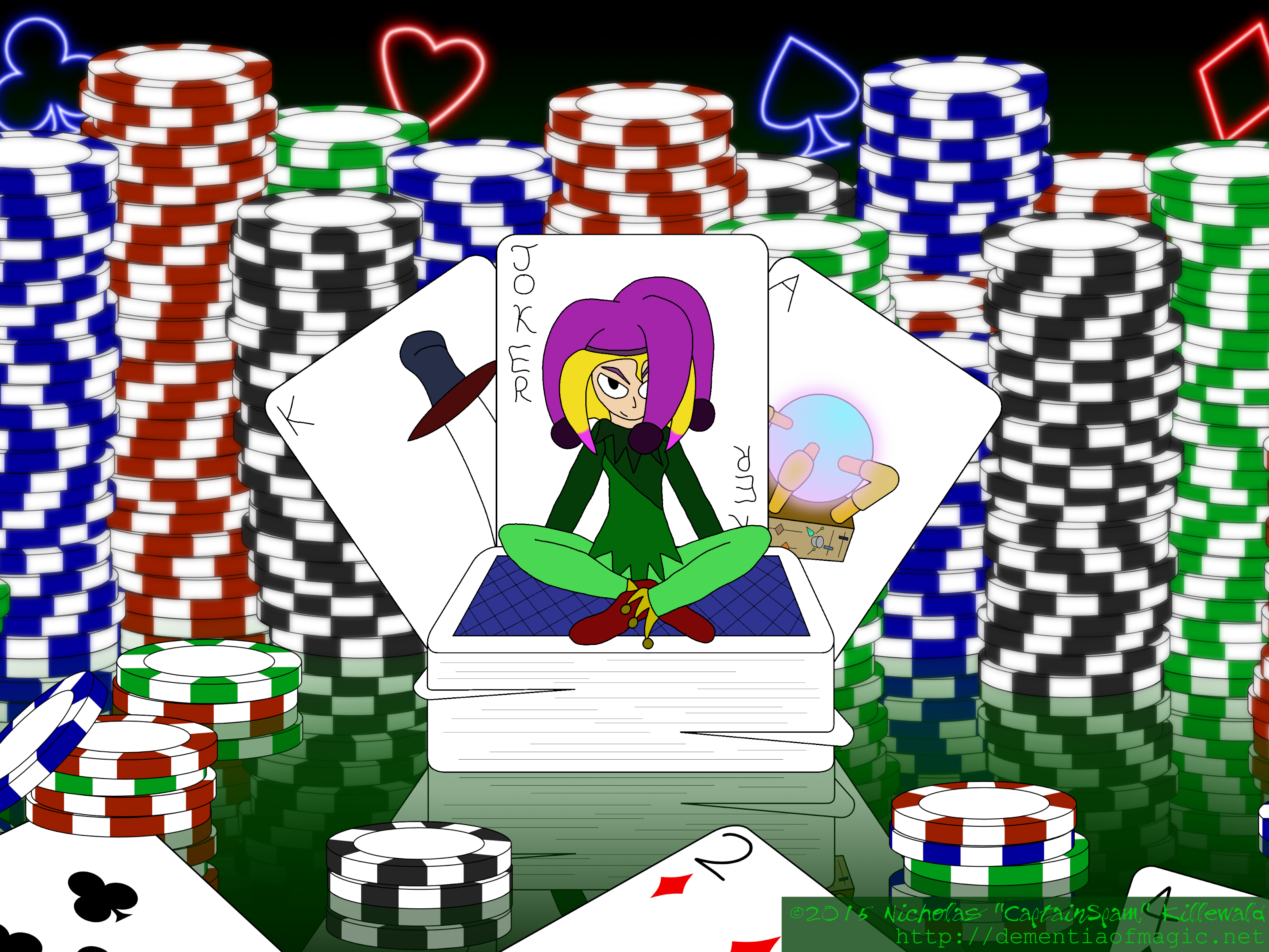 This one might look familiar if you bought the book. This wildly non-canon outfit for Stephanie appeared as a sketch somewhere in there for fun. And, despite the fact she wouldn't be caught dead in a jester's outfit again, I always told myself that I'd turn that sketch into a wallpaper at some point. Now, thanks to way too many vector objects making up those chip stacks, such a wallpaper exists!